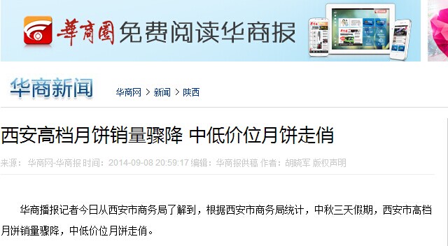 华商播报记者今日从西安市商务局了解到,根据西安市商务局统计,中秋三天假期,西安市高档月饼销量骤降,中低价位月饼走俏。