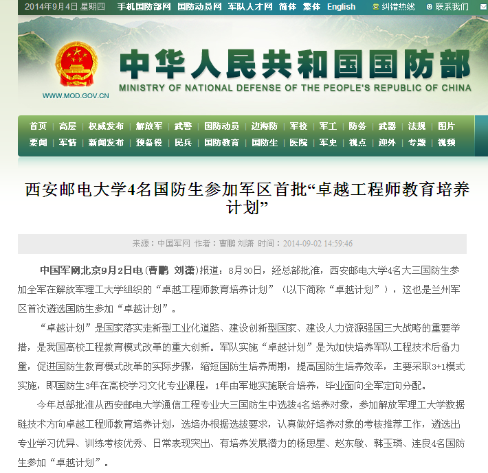 相关链接:http://www.mod.gov.cn/cadets/2014-09/02/content_4534603.htm
