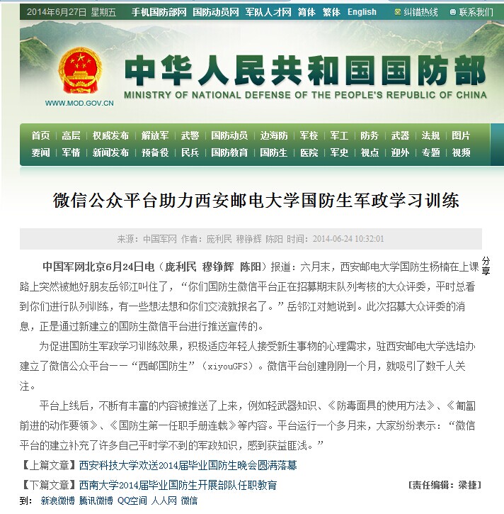 相关链接:http://www.mod.gov.cn/cadets/2014-06/24/content_4518215.htm