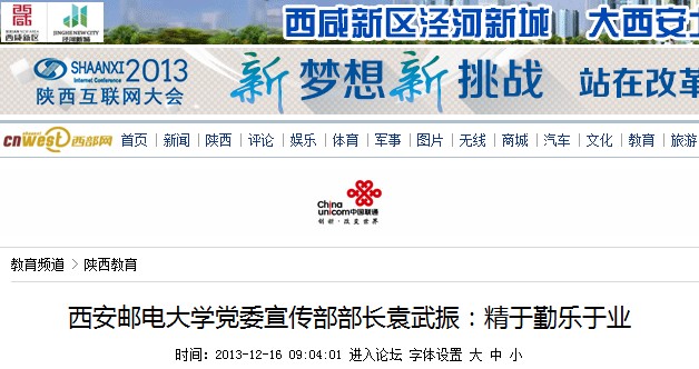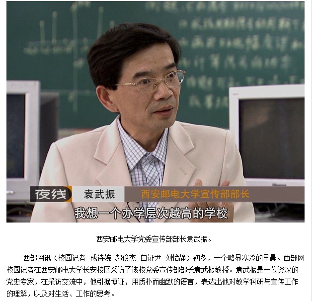 袁武振:我们宣传工作的指导思想是围绕中心,服务大局,弘扬主旋律,传播正能量。37000v威尼斯正致力于建设有特色高水平的邮电大学,宣传部的责任是正确引导舆论倾向,营造良好的思想舆论环境,为学校改革发展提供强大的精神动力和思想保证。2014年,我们将进一步做好选题和策划,加强与社会媒体的联系,建设好校内宣传平台,广泛宣传37000v威尼斯各方面建设取得的成就,为提升办学水平和办学质量加油鼓劲。