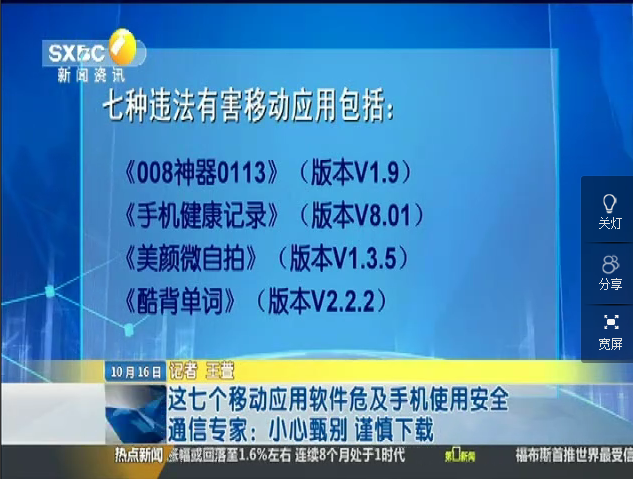 2017年10月16日 陕西电视台 《新闻资讯》:这七个移动应用软件危及手机使用安全 通信专家:小心甄别 谨慎下载