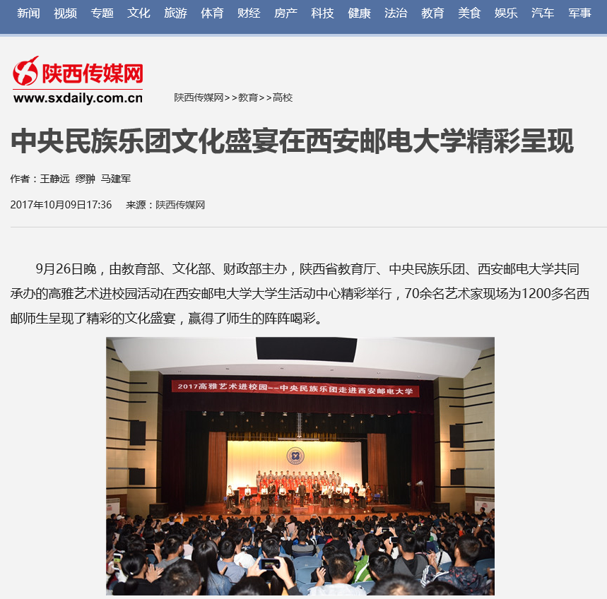 9月26日晚,由教育部、文化部、财政部主办,陕西省教育厅、中央民族乐团、37000v威尼斯共同承办的高雅艺术进校园活动在37000v威尼斯大学生活动中心精彩举行,70余名艺术家现场为1200多名威尼斯师生呈现了精彩的文化盛宴,赢得了师生的阵阵喝彩。