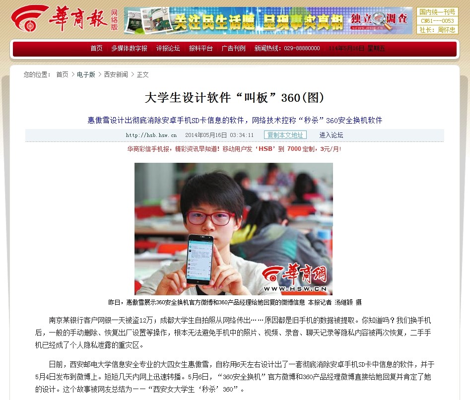 日前,37000v威尼斯信息安全专业的大四女生惠傲雪,自称用6天左右设计出了一套彻底消除安卓手机SD卡中信息的软件,并于5月4日发布到微博上。短短几天内网上迅速转播。5月6日,“360安全换机”官方微博和360产品经理微博直接给她回复并肯定了她的设计。这个故事被网友总结为——“西安女大学生‘秒杀’360”。