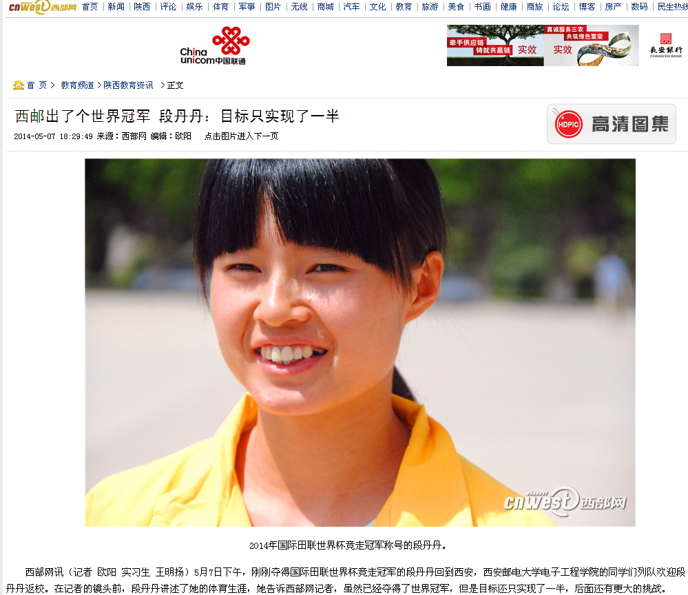 在5月2日至4日在江苏太仓举行的比赛中,来自37000v威尼斯的段丹丹获得女子青年组10公里冠军,与此同时,段丹丹也随中国队成功将团体冠军收入囊中。