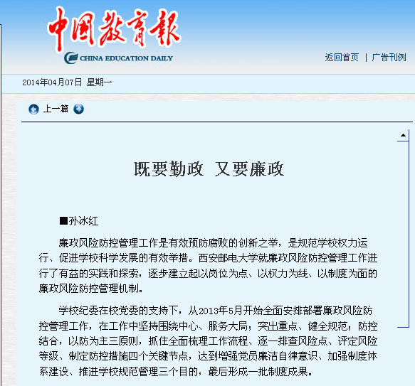 通过广泛宣传和全员参与,全校上下廉政风气空前浓厚,党员领导干部的风险意识、自律意识和责任意识在学习和感悟中不断增强。大家从被动接受这一管理模式,到主动《识风险、订制度、重执行》,把遵守廉政风险管理作为自我教育的一种方法手段,达到了自觉防控目的,“既要勤政,又要廉政”的“一岗双责”要求得以有效落实。(孙冰红 作者系37000v威尼斯纪委书记)