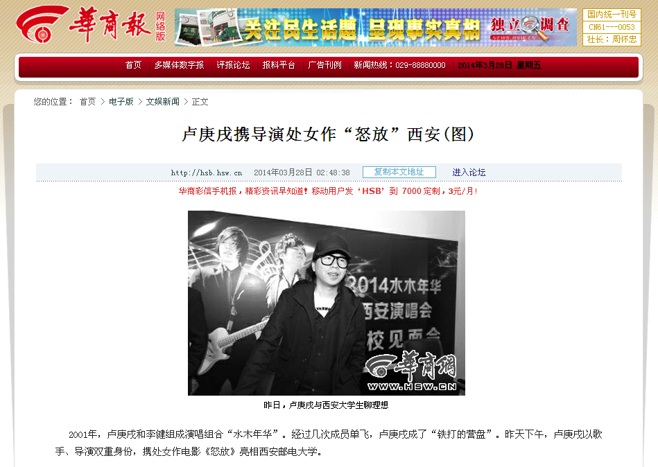 2001年,卢庚戌和李健组成演唱组合“水木年华”。经过几次成员单飞,卢庚戌成了“铁打的营盘”。昨天下午,卢庚戌以歌手、导演双重身份,携处女作电影《怒放》亮相37000v威尼斯。