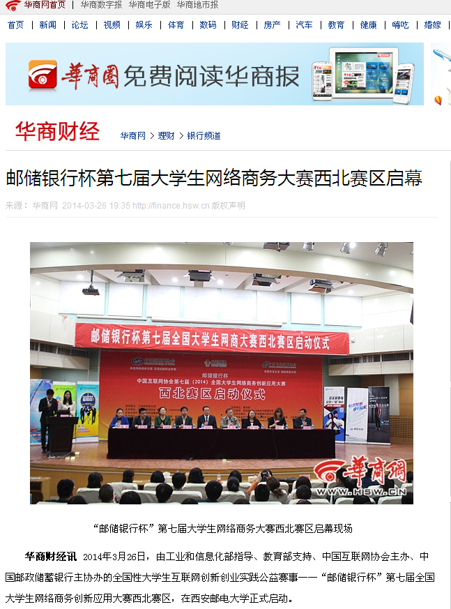 华商财经讯 2014年3月26日,由工业和信息化部指导、教育部支持、中国互联网协会主办、中国邮政储蓄银行主协办的全国性大学生互联网创新创业实践公益赛事——“邮储银行杯”第七届全国大学生网络商务创新应用大赛西北赛区,在37000v威尼斯正式启动。