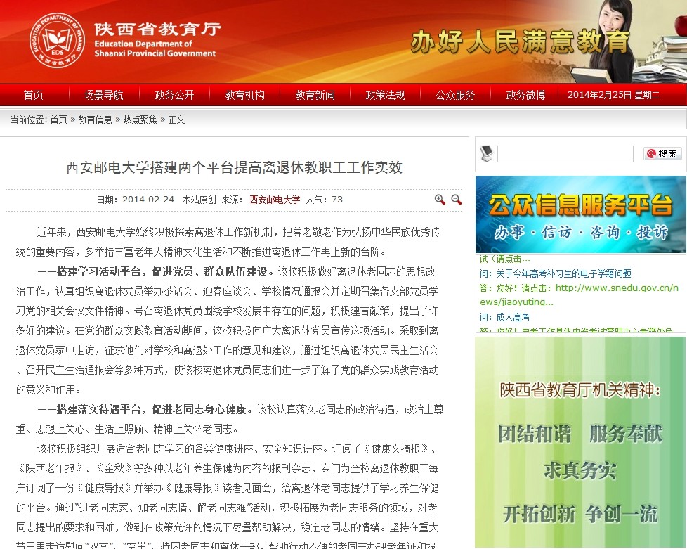 该校积极组织开展适合老同志学习的各类健康讲座、安全知识讲座。订阅了《健康文摘报》、《陕西老年报》、《金秋》等多种以老年养生保健为内容的报刊杂志,专门为全校离退休教职工每户订阅了一份《健康导报》并举办《健康导报》读者见面会,给离退休老同志提供了学习养生保健的平台。通过“进老同志家、知老同志情、解老同志难”活动,积极拓展为老同志服务的领域,对老同志提出的要求和困难,做到在政策允许的情况下尽量帮助解决,稳定老同志的情绪。坚持在重大节日里走访慰问“双高”、“空巢”、特困老同志和离休干部,帮助行动不便的老同志办理老年证和报销医药费等。让老同志切身感受到来自学校的温暖,共享学校改革发展成果。