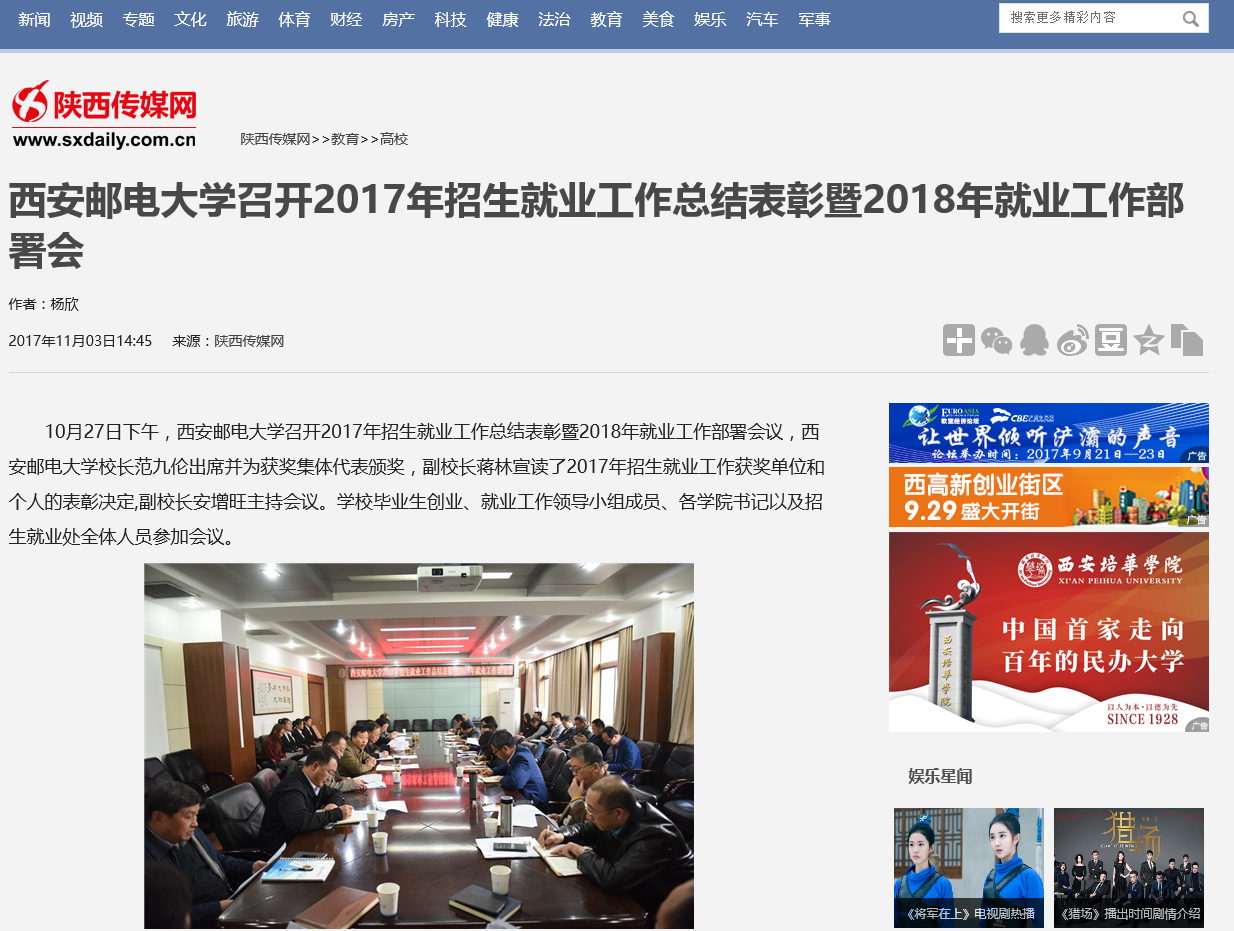 会上,蒋林宣读了2017年招生就业工作获奖单位和个人的表彰决定。2017年就业工作先进集体一等奖为自动化学院、二等奖为通信与信息工程学院、三等奖为电子工程学院和理学院;2017年招生宣传先进集体一等奖为计算机学院、二等奖为数字艺术学院、三等奖为通信与信息工程学院和外国语学院,并对52名招生宣传先进个人予以表彰。